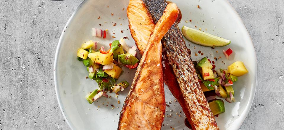 Skær mango, avocado og rødløg i tern, og bland det sammen med chili, koriander, flydende honning og limesaft til en salsa.