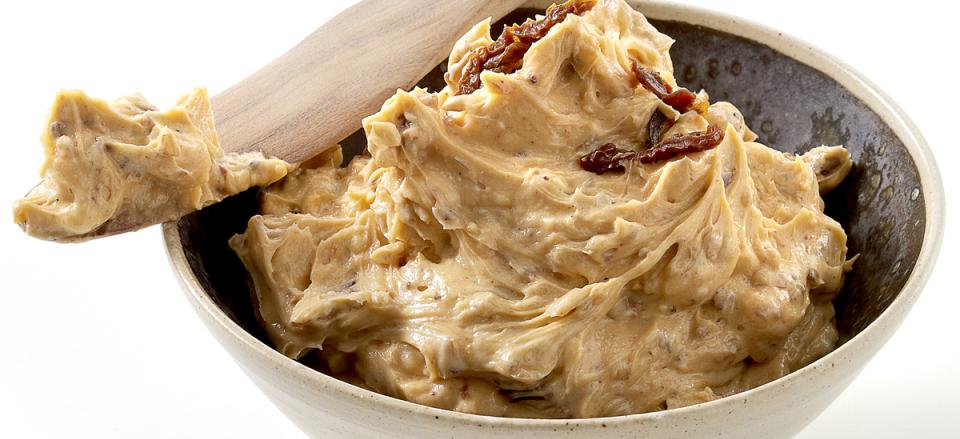Pisk smørret med en elpisker, vend ketchup i sammen med løg og tomatblandingen.
