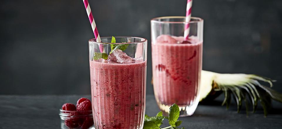 Blend herefter juicen med kokosvand, mynte og hindbær.