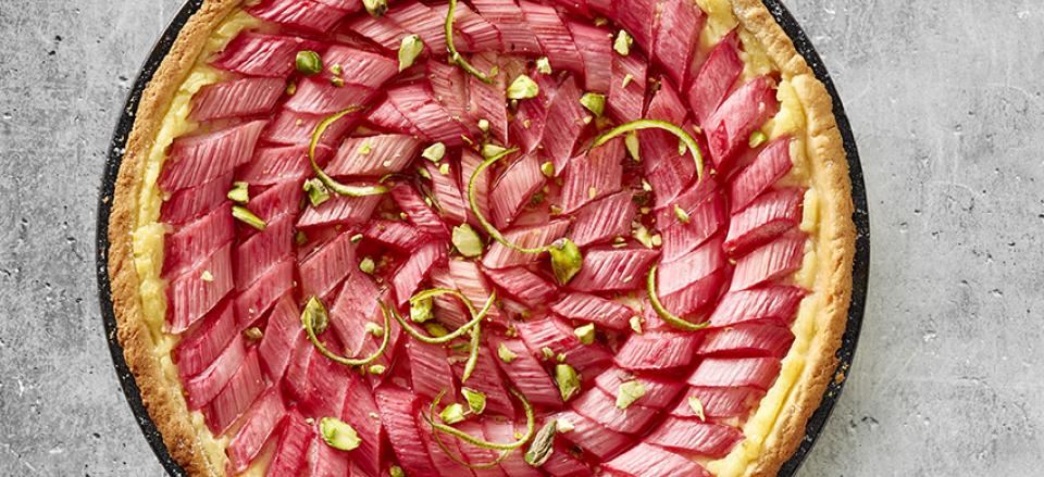 Sommersød rabarbertærte med pistacie og kandiseret lime