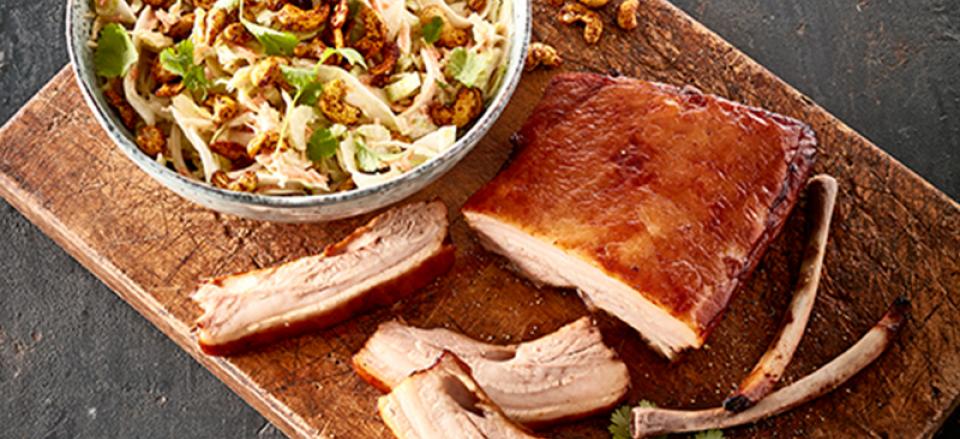 Sous vide BBQ-marineret revelsben med coleslaw og spicy cashewnødder