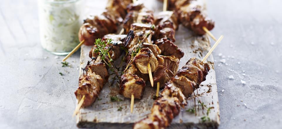 Fordel kødet på spyddene og vend dem med olivenolie, timian samt salt og peber.