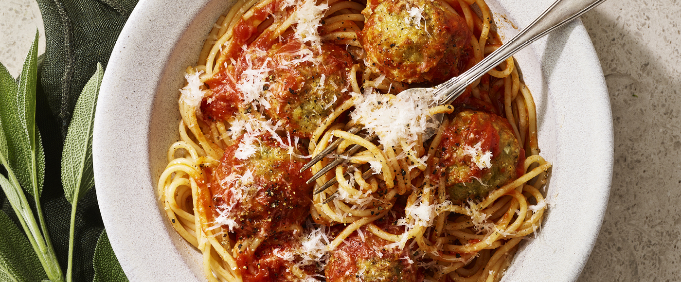 Gem 1 dl af kogevandet, inden det sigtes fra, og vend pasta, sauce og kødboller sammen med det gemte kogevand.