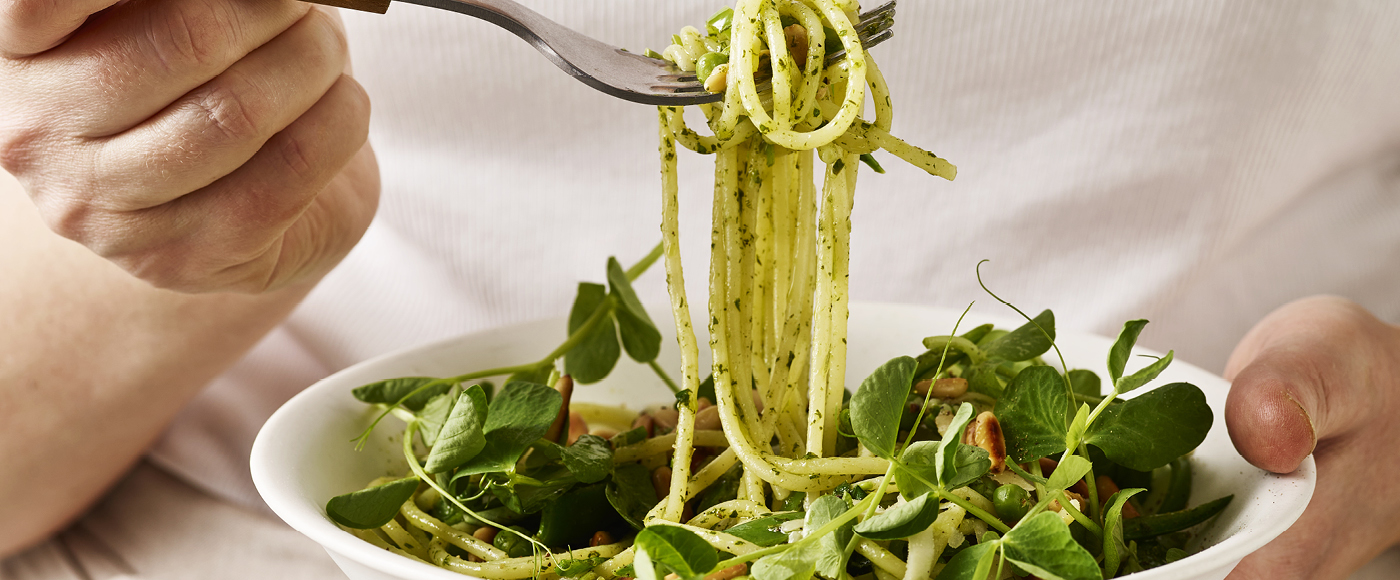 Spaghetti med persilleolie, ærter og pinjekerner