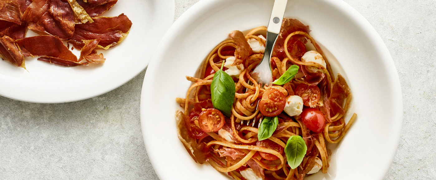 Spaghetti med pesto, friske tomater og sprød parmaskinke