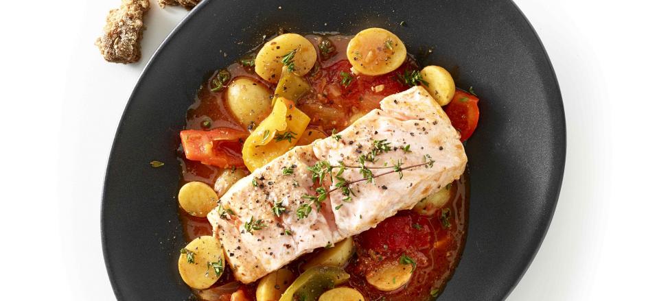 Placer laksestykkerne på toppen af gryderetten og læg låget på igen.
