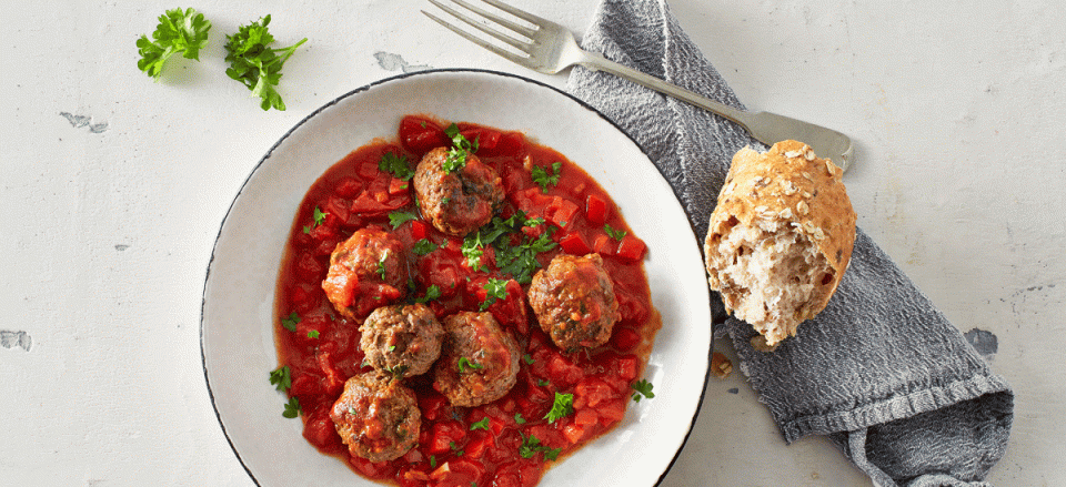 Skær pebrene i små tern, brun dem sammen med kødbollerne et kort øjeblik og krydr med resten af paprikaen og hvidløget.