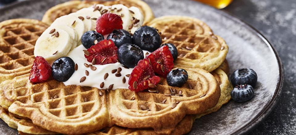 Top vaflerne med skyr, banan, hindbær og blåbær og evt. lidt honning og ekstra hørfrø.