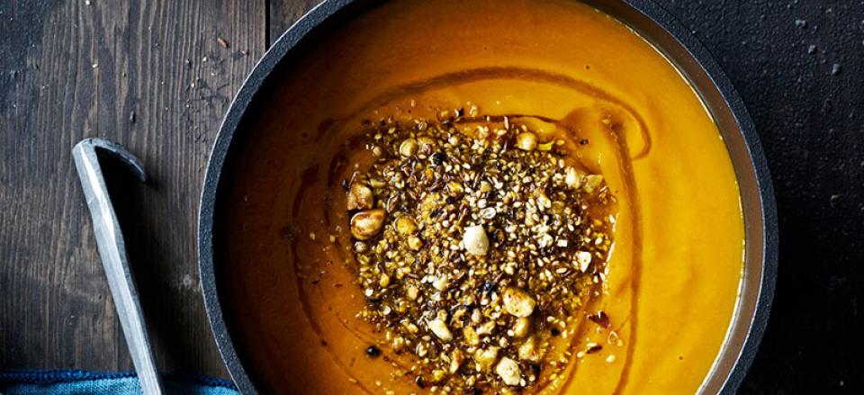 Server suppen med dryp af olivenolie og et drys dukkah.