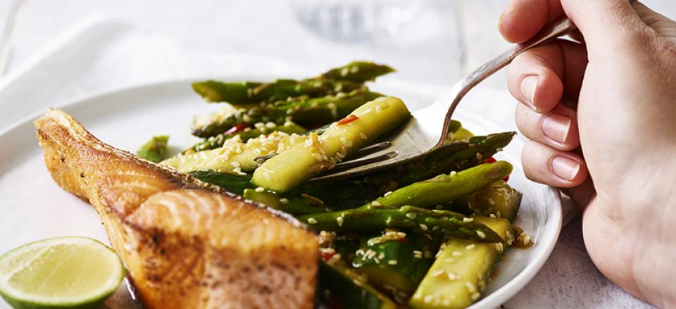 Spicy lynstegt agurk og asparges med grillet laks