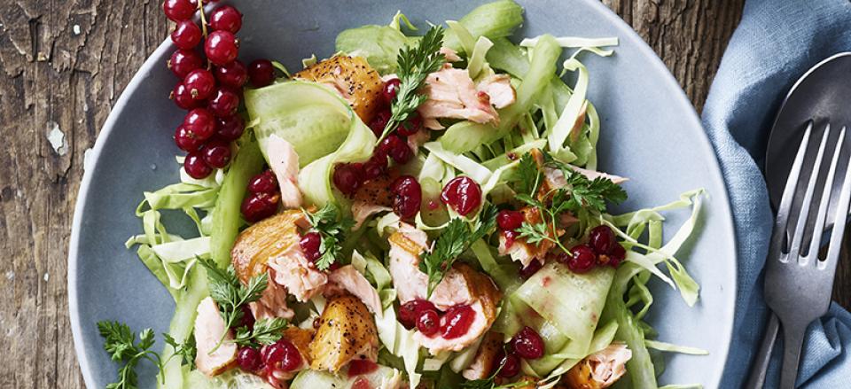 Fjern skindet fra fisken og pluk kødet i mindre stykker og anret det over grøntsagerne.