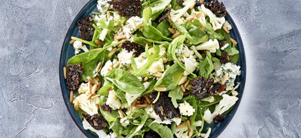 Pynt salaten af med ristede pinjekerner, brud af blue cheese, og rugbrødschips.