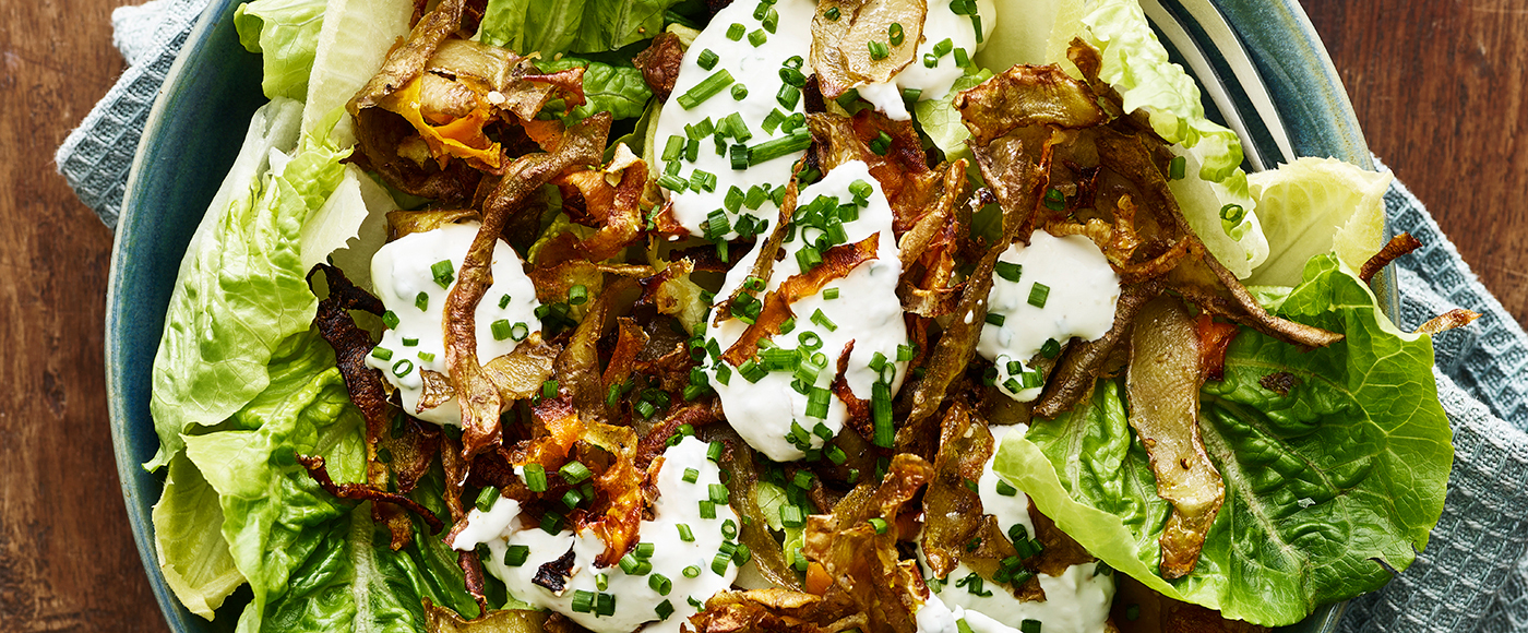 Top med dressing, sprøde skræller og et drys purløg.