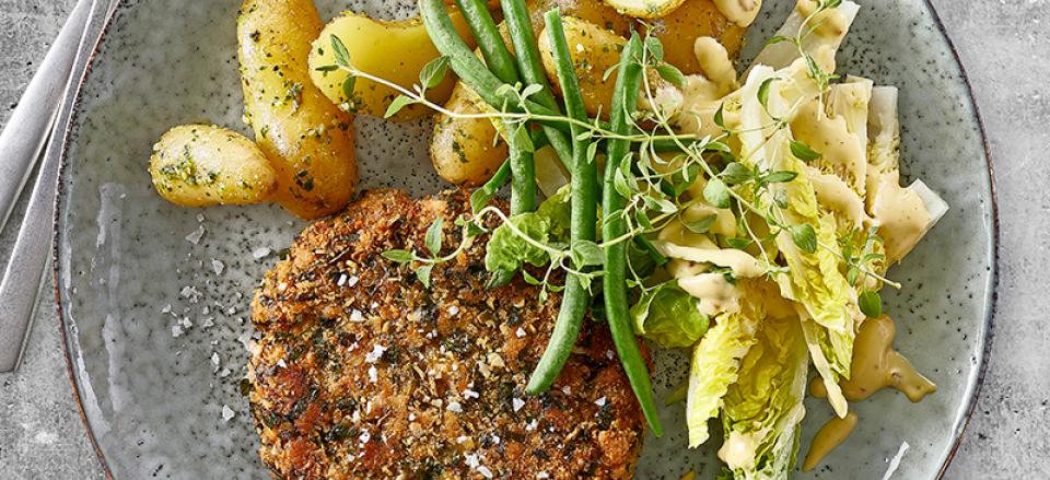 Sprøde karbonader med krydderurtepanering og aspargeskartofler