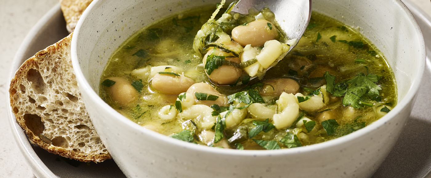 Squashsuppe med bønner, pasta og gremolata