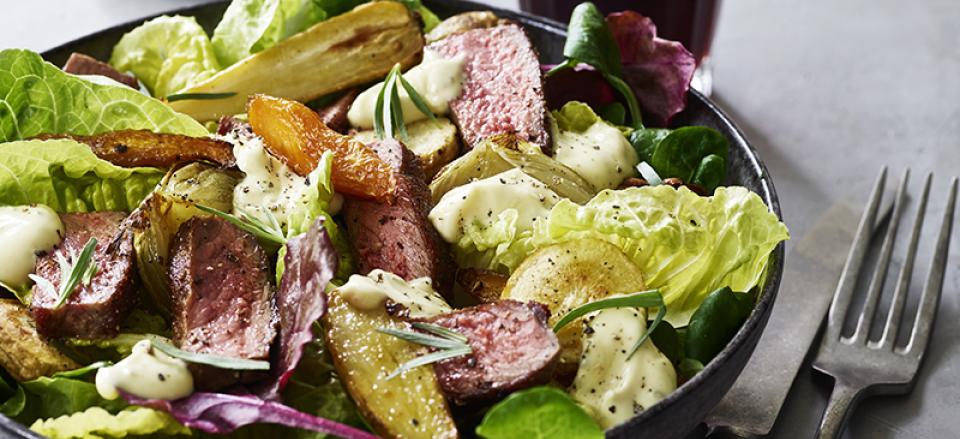 Pluk salaten og anret med de bagte rodfrugter, stykker af kød og kold béarnaise sauce.