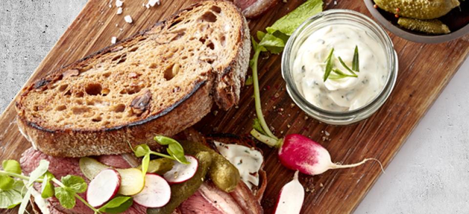 Steaksandwich med kalveculotte, bearnaisedip, cornichoner og ærteskud