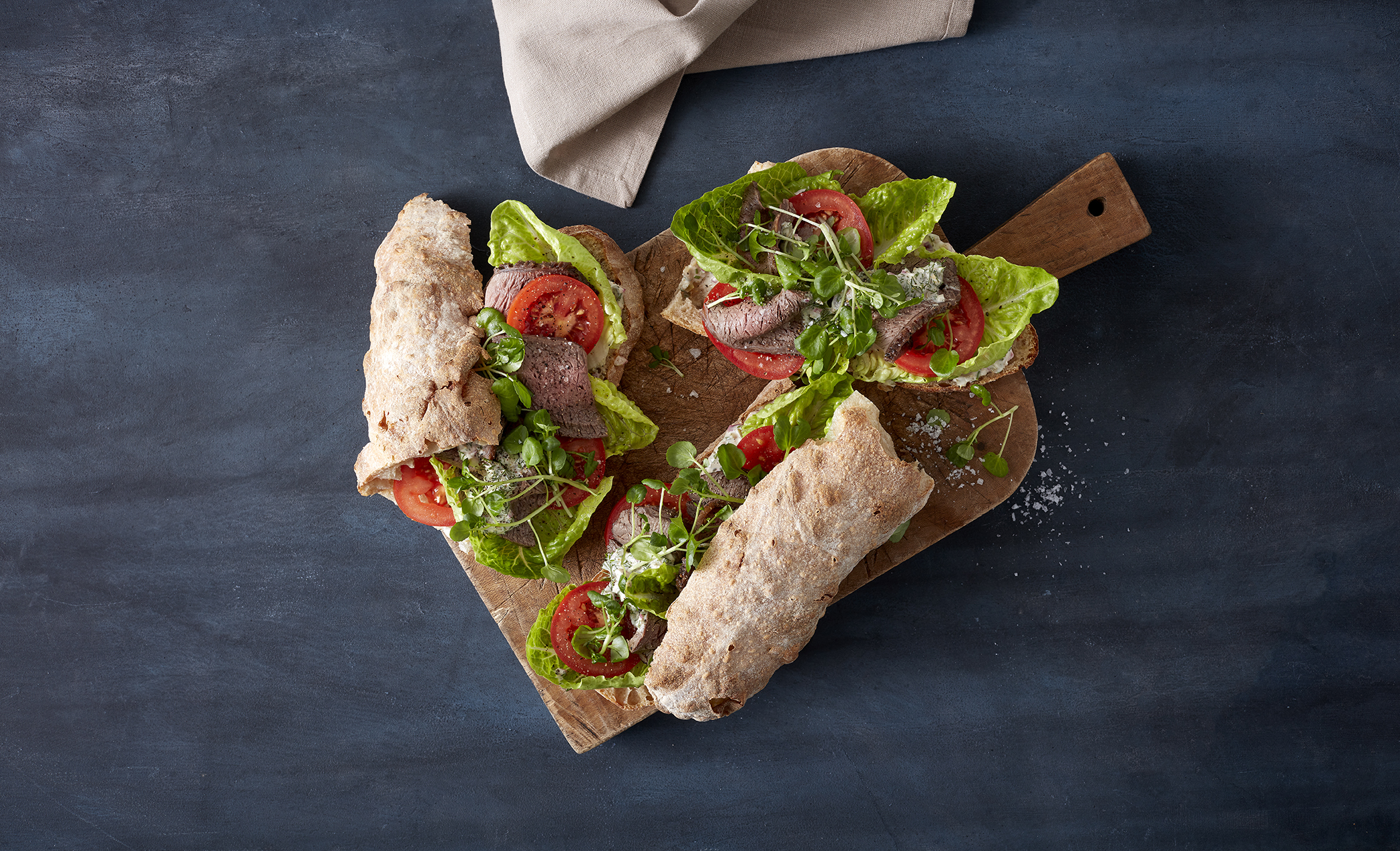 Smør brødet med tartarsauce, og top med salatblade, tomatskiver, skiver af culottestegen og brøndkarse.