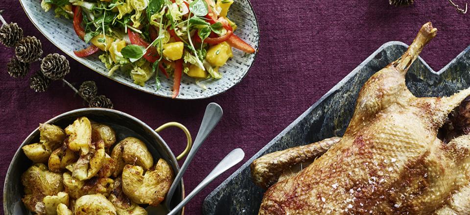Sænk temperaturen til 180°C og steg anden i 2½ timer.