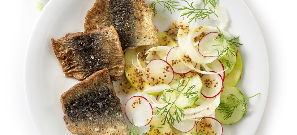 Servér stegt hornfisk med sprød, grøn salat og kartofler med olivenolie og salt.
