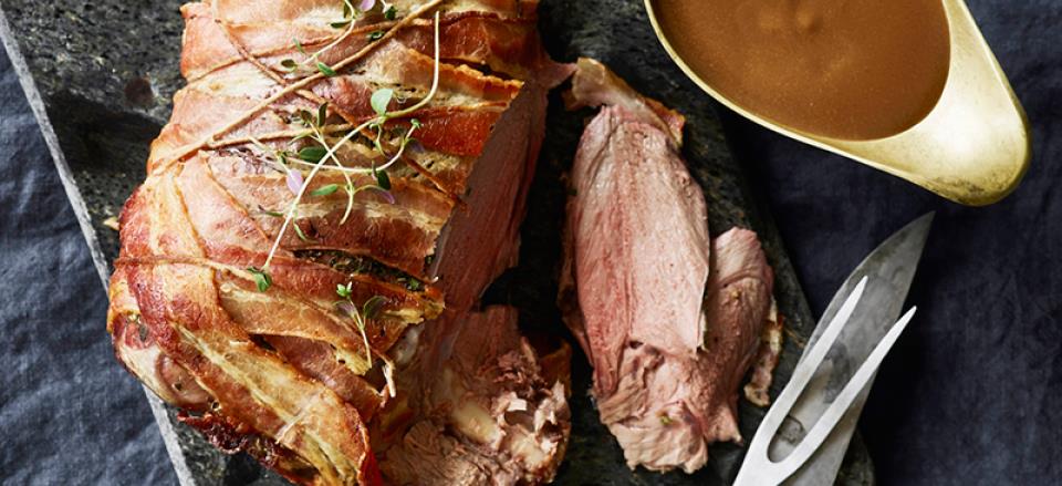 Pak køllen ind i bacon og snør den sammen med kødsnor.