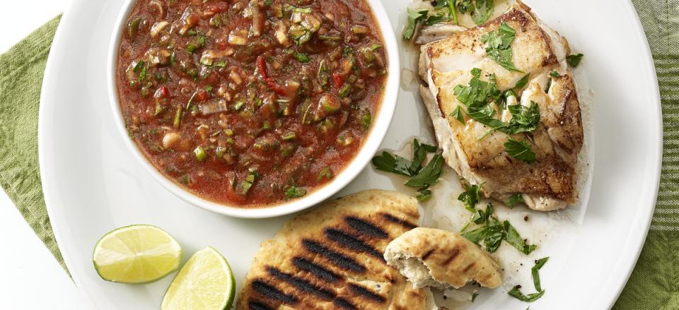 Stegt Kullerfilet med spicy tomatsauce og grillet naanbrød
