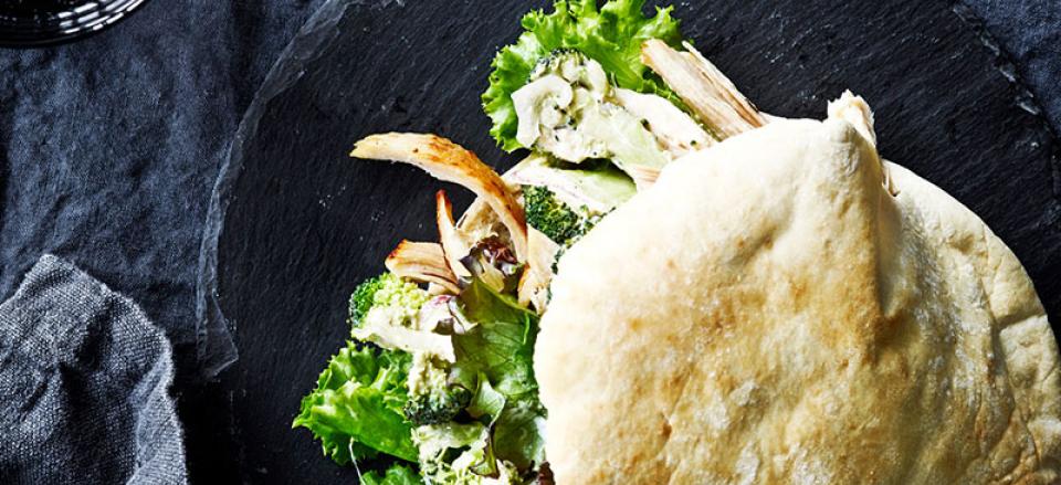 Fyld pitabrødene med kylling, salatblade og broccolisalat.
