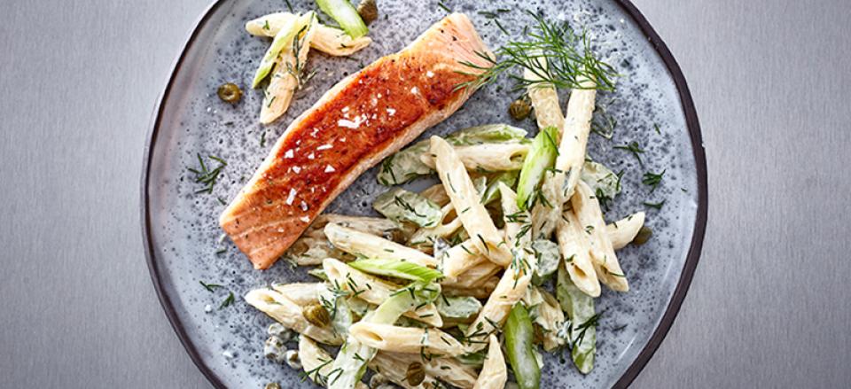 Vend kogt pasta i saucen sammen med kapers, fintsnittet bladselleri og dild.