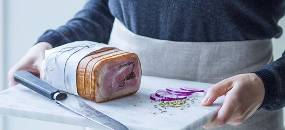 Læg den i pres i køleskabet – enten i en rullepølsepresse eller i en form med noget tungt over.