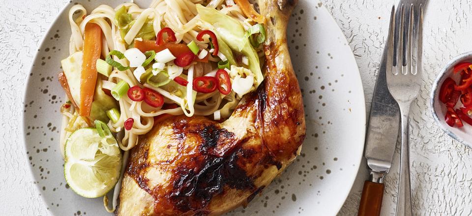Sticky chili kyllingelår med risnudler