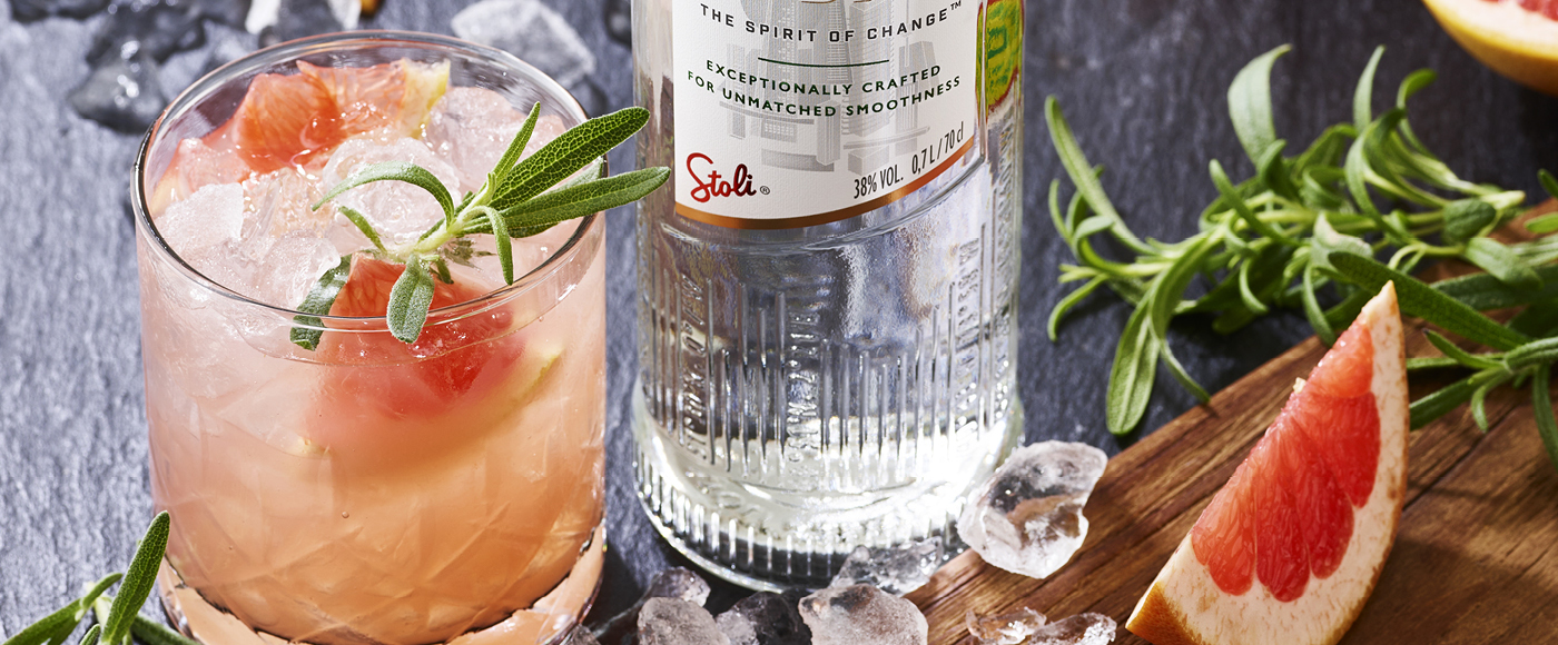 Kom Stoli Vodka i et glas med is og tilføj pink grape sodavand/tonic.