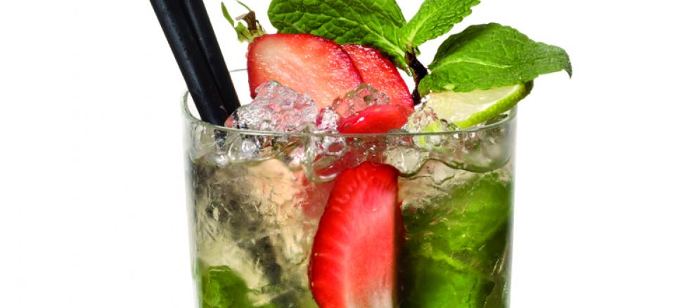 Hæld Cuba Strawberry og danskvand over - fyld op med knust is og pynt med friske jordbær.
