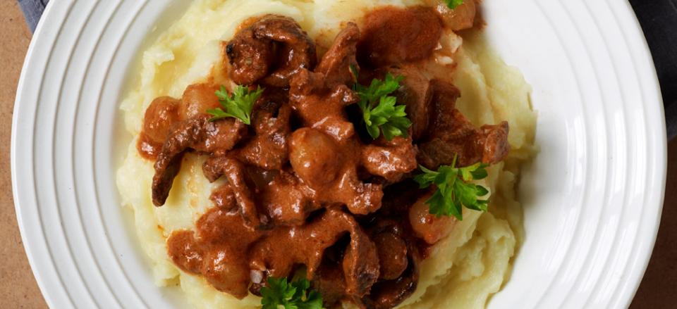 Server stroganoff med f.eks. sellerimos eller kartoffelmos til.