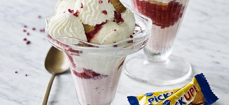 Kom is i serveringsglas og top med jordbærsauce, flødeskum og Pick-up Minis.