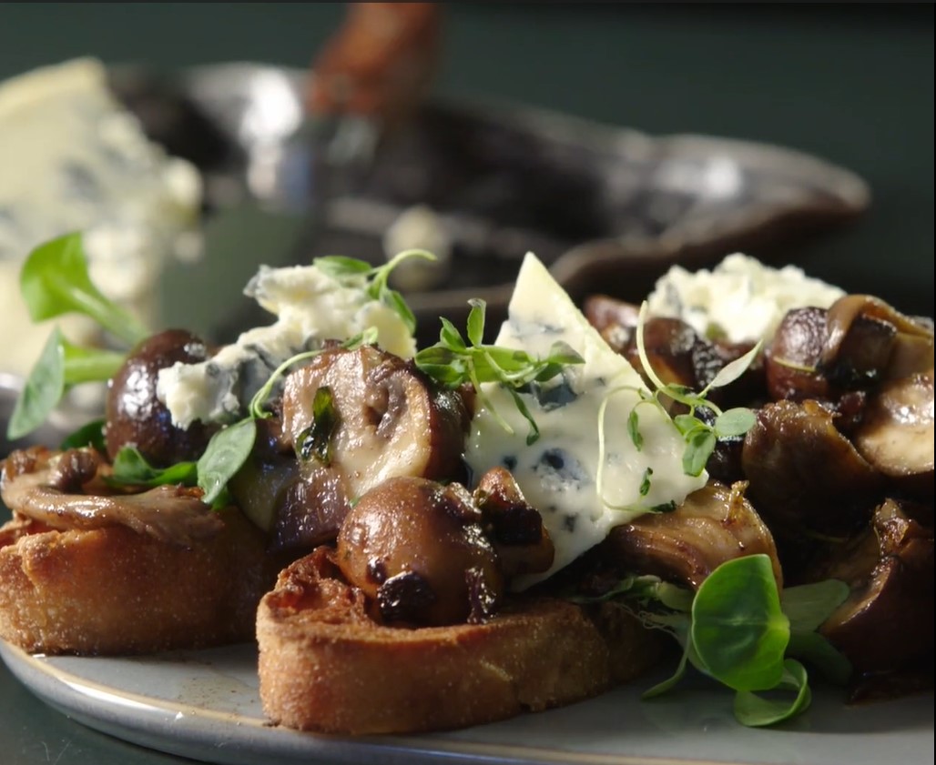 Læg lidt feldsalat på brødskiverne, fordel svampene ovenpå og top med gavmilde skiver af Saint Agur og frisk timian.