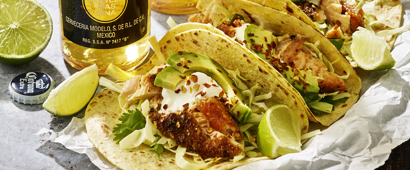 Tacos med grillet laks, spidskålsalat og avocado