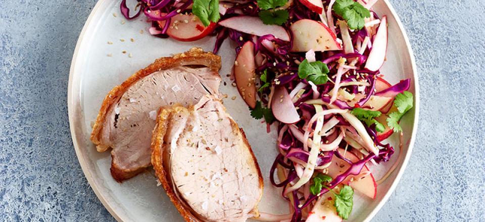 Anret kålsalat og flæskesteg på tallerkener og pynt med frisk koriander.