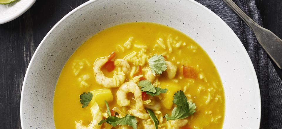 Kom karrypaste i, og tilsæt så ris, bouillon, kokosmælk og fishsauce.