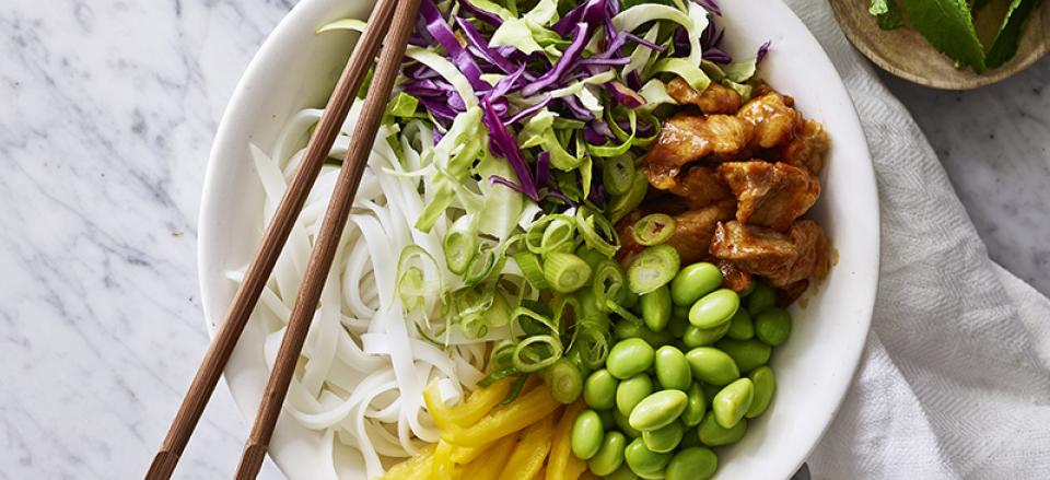 Kom nudler, kød, edamamebønner, mynte og koriander oven på.