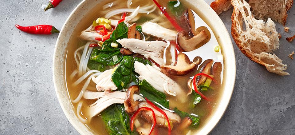 Kog suppen 10 min. og tilsæt nudler, spinat, resten af forårsløgene snittet fint samt kyllingekød.