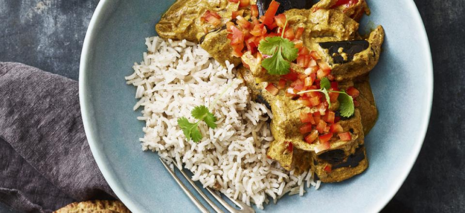 Server med rispilaf, hakket peberfrugt og koriander og evt. naan til.