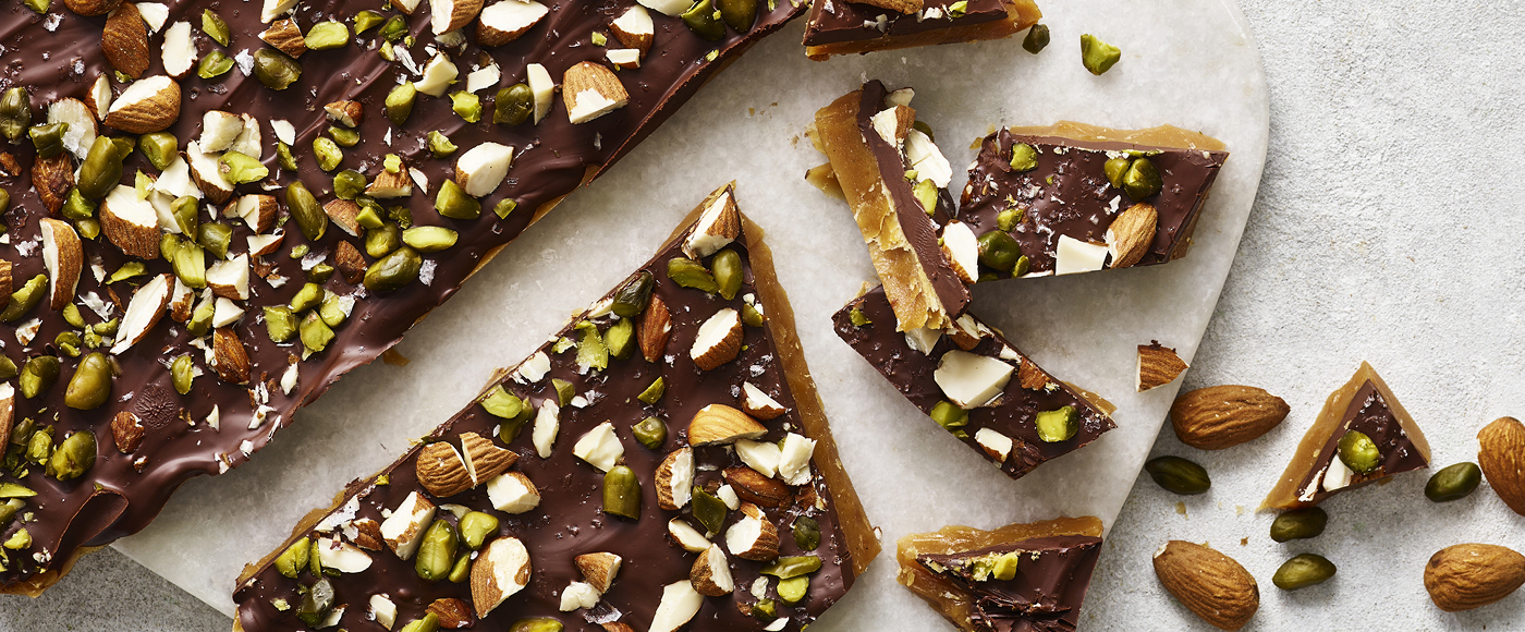 Drys hakket chokolade over, mens toffeemassen stadig er varm.