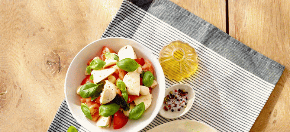 Anret i en skål, skiftevis tomatskiver og mozzarella skiver.