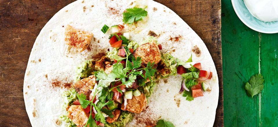Server i lune tortillas med tomatsalat, avocado, cremefraiche og koriander.