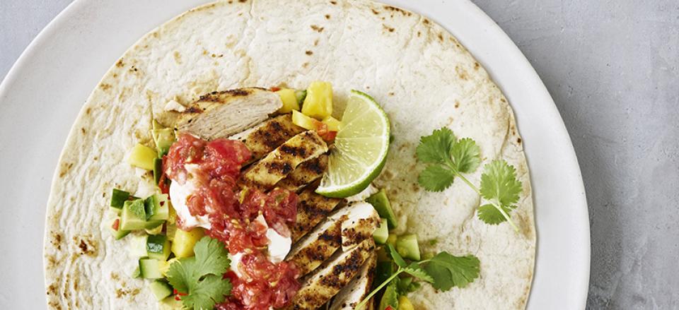 Tortillas med grillet kylling, mango-avocadosalat og rå tomatsalsa