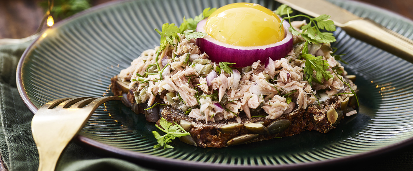 Anret på smurt rugbrød, og kom løgringe og en æggeblomme på toppen af hver mad.