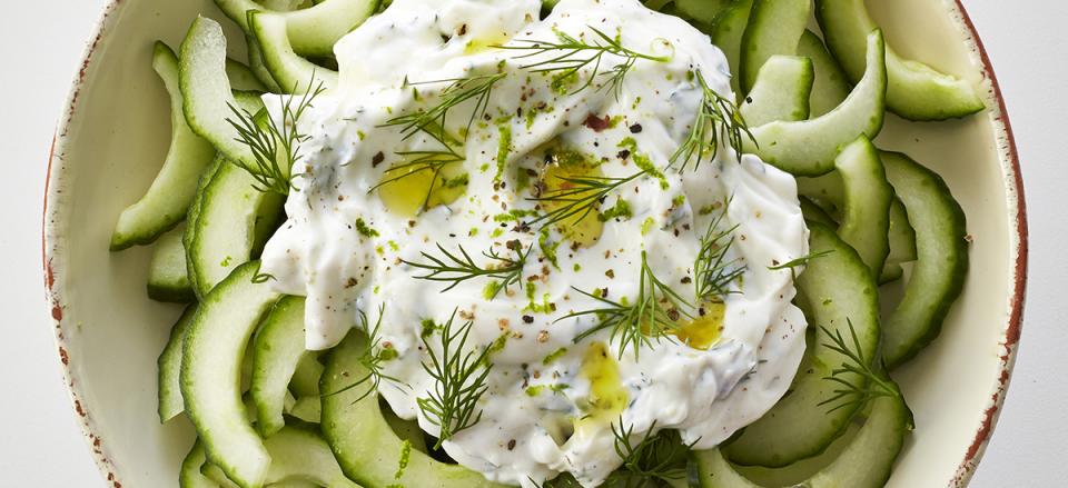 Rør økologisk yoghurt, naturel fra naturmælk 3,5 % sammen med knust hvidløg, limeskal og saft, olivenolie, hakket dild og kværnet fem peber.