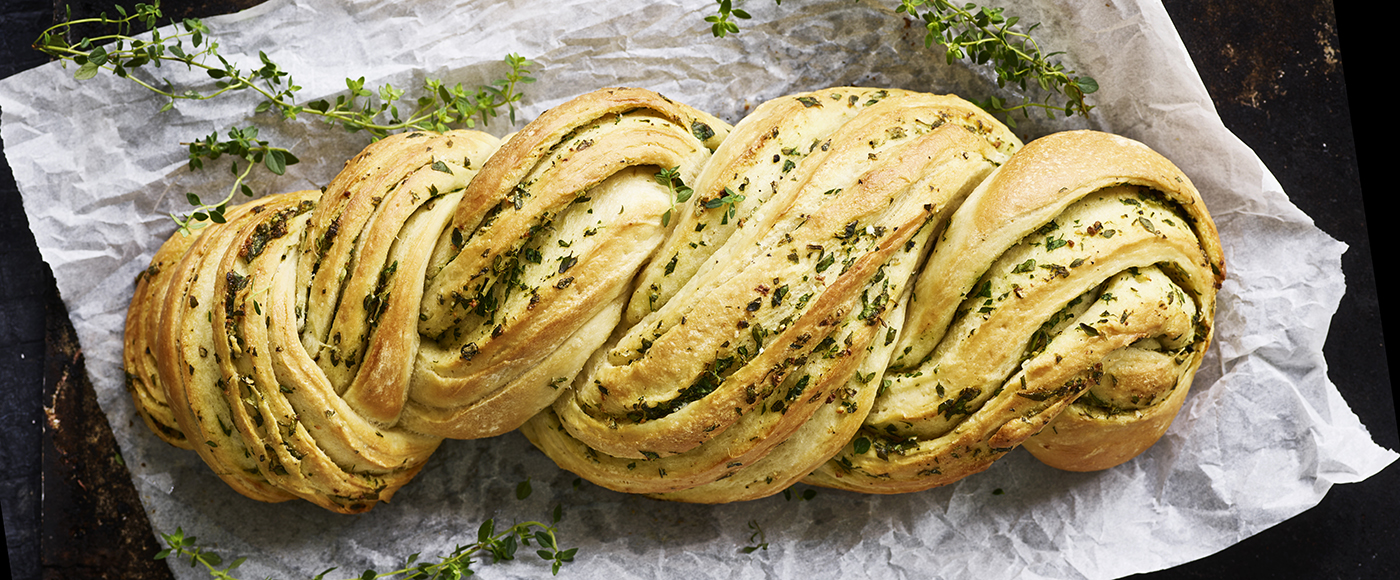 Smør kryddersmørret ud på dejen, og rul den sammen på den lange led.