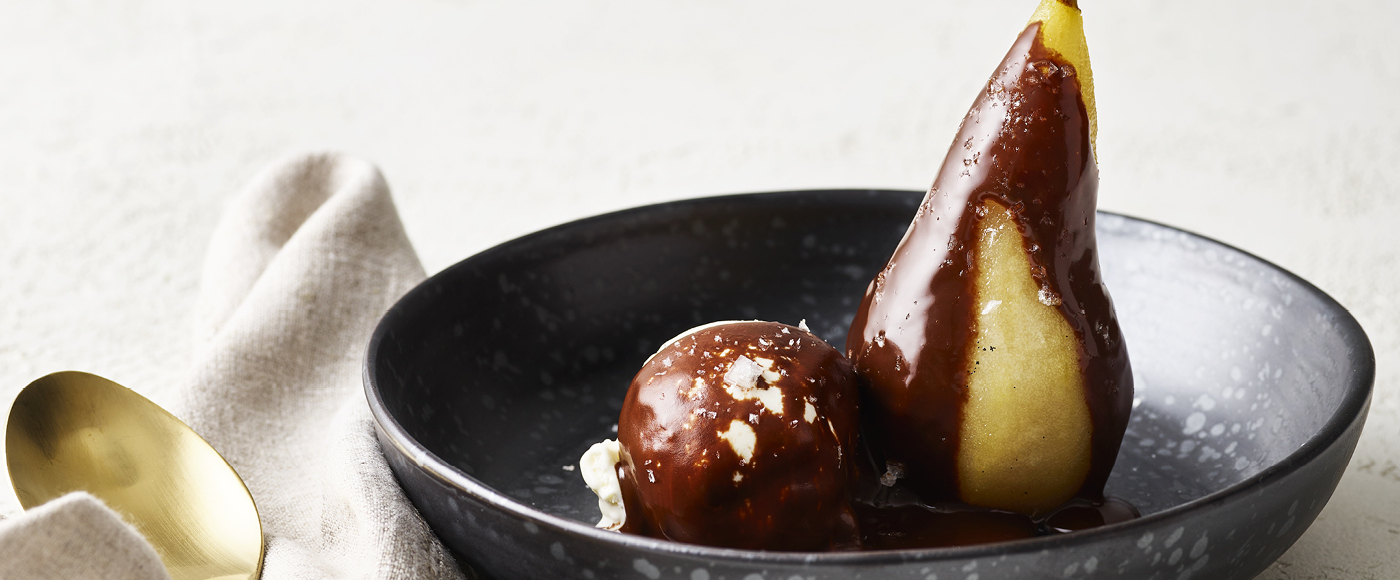 Sæt en pære på en desserttallerken og kom en kugle vaniljeis ved siden af.