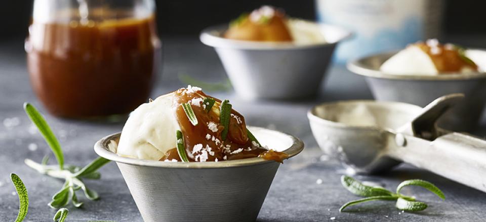 Lad karamellen køle en smule af, før den hældes over vaniljeis.